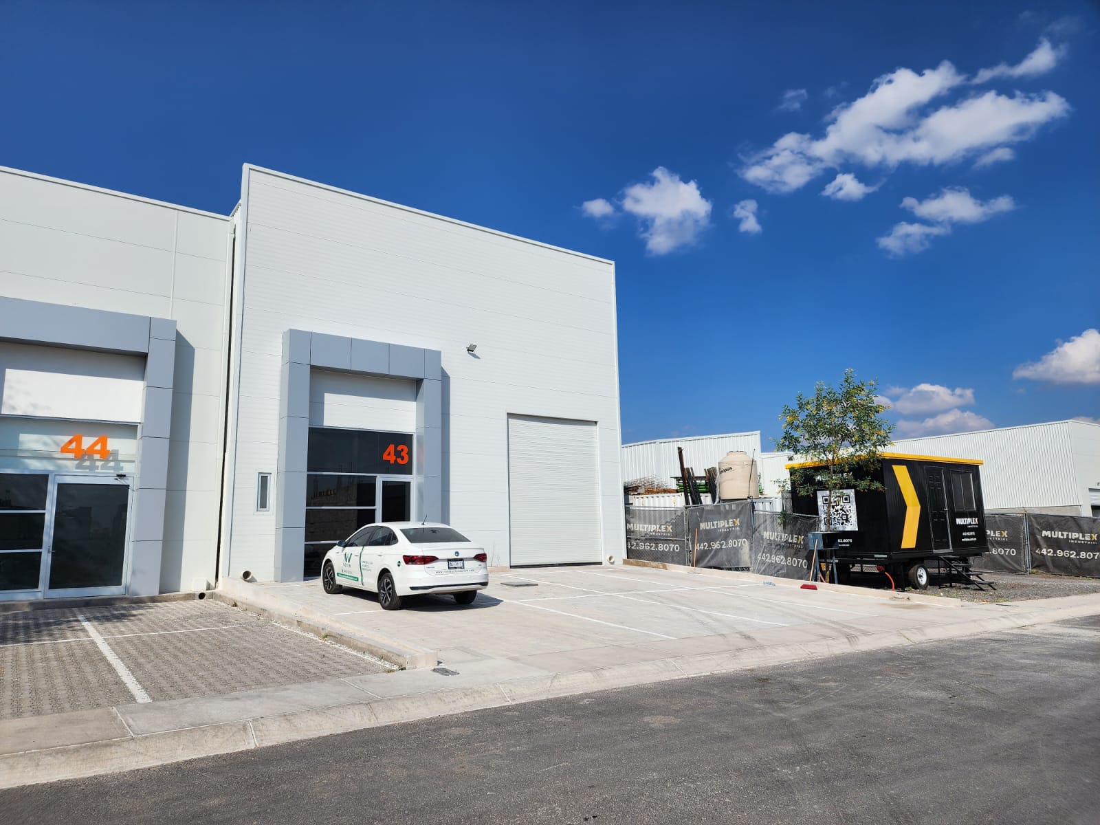 - Equipamiento y Exteriores: El proyecto incluye un estacionamiento de concreto de 10 cm de espesor con 2 cajones de servicio, un anden de carga y descarga con cortina rápida y un sistema pluvial aéreo con tubería de PVC de 8″.